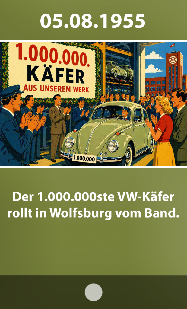 Am 5. August 1955 rollte im Werk von Volkswagen in Wolfsburg der einmillionste VW Käfer vom Band. Diese Zahl war weit mehr als eine Produktionsmarke. Sie fiel in eine Phase, in der sich die junge Bundesrepublik Deutschland wirtschaftlich stabilisierte und spürbar veränderte. Der Käfer wurde in diesem Moment zum sichtbaren Ausdruck eines neuen Selbstverständnisses: weg von Mangel und Improvisation, hin zu Verlässlichkeit, Planung und wachsendem Wohlstand.