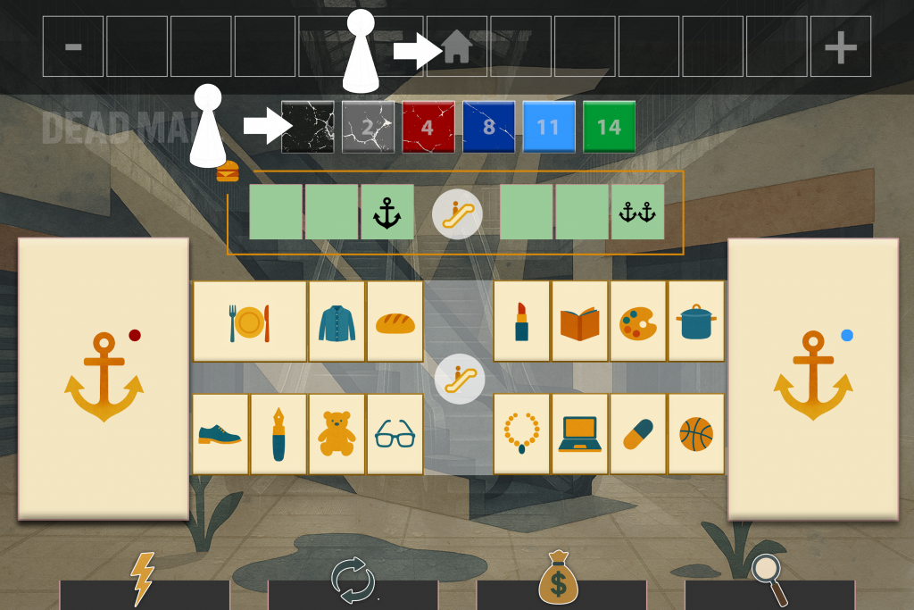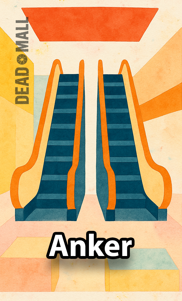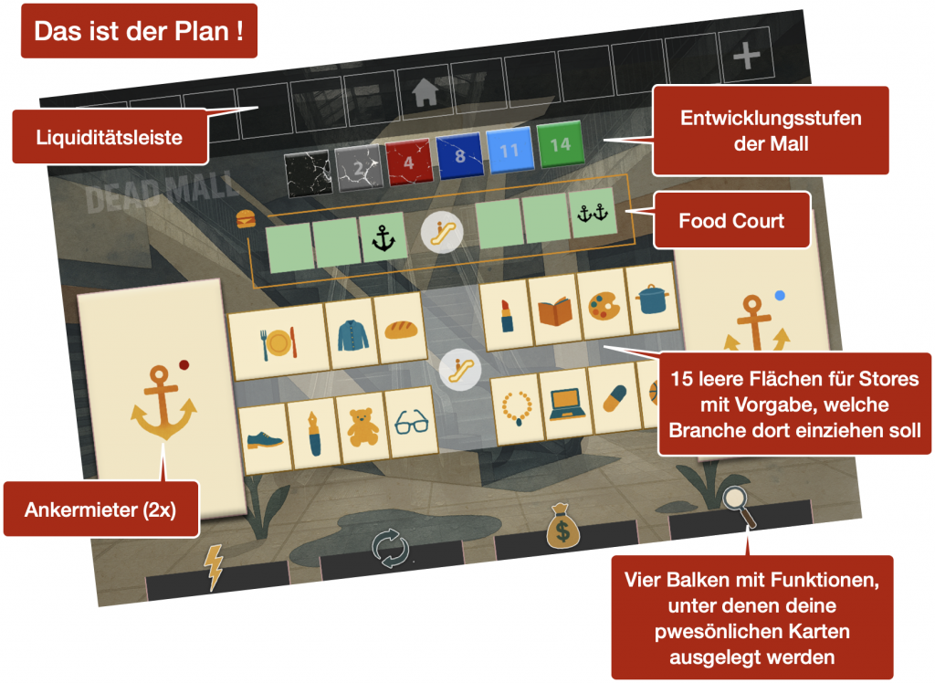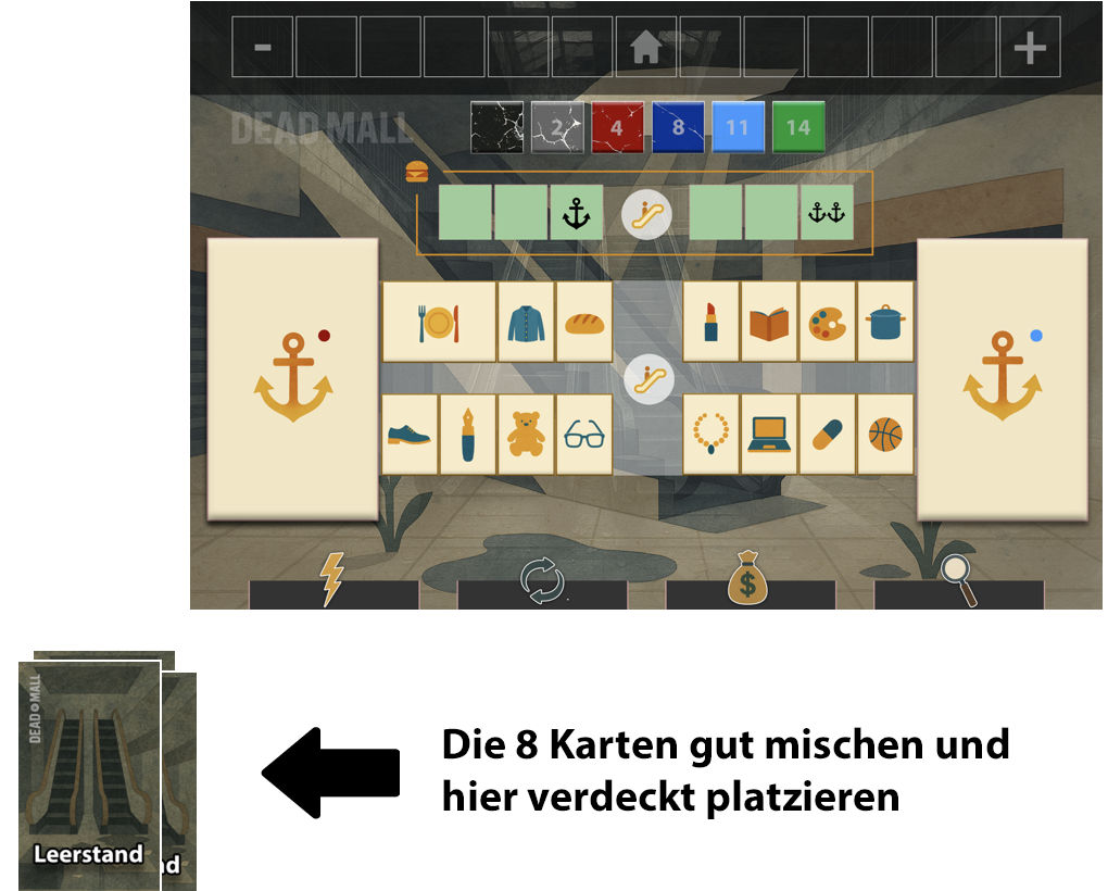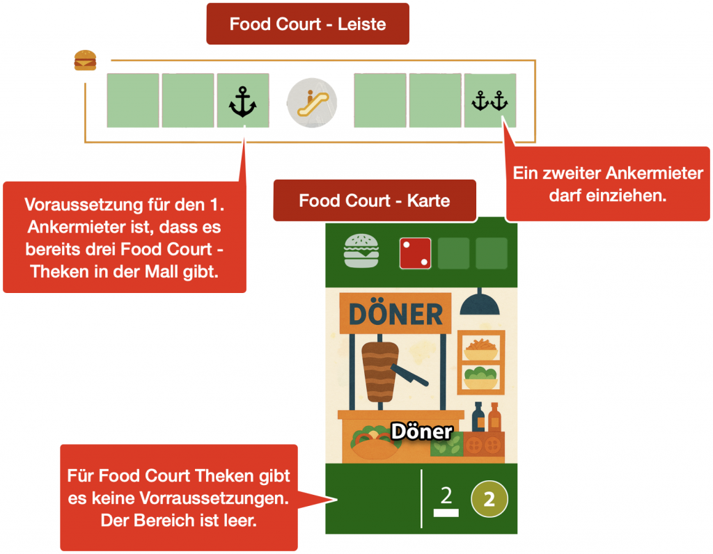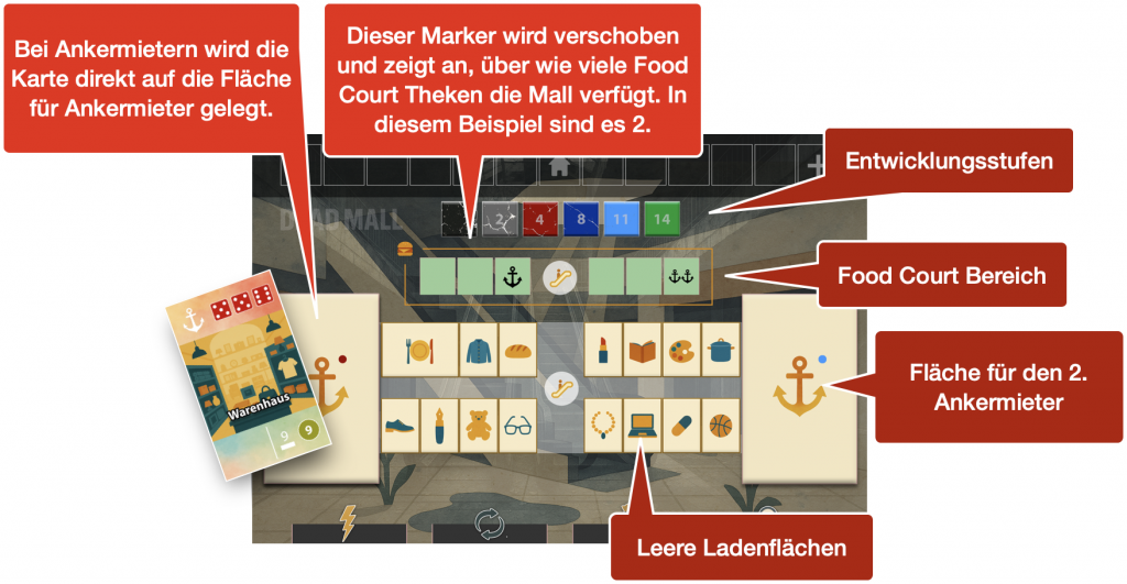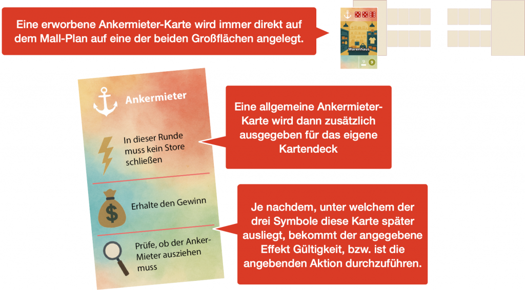 Zieht ein Ankermieter ein, also ein sehr grosses Geschäft wie zB. ein Warenhaus, wird die Ankermieter-Karte direkt auf die erste der beiden größeren Flächen mit dem Anker-Symbol abgelegt. Der zweite Ankermieter (nur zwei sind möglich) nimmt später die große Ladenfläche ganz rechts auf dem Mall-Plan ein.
