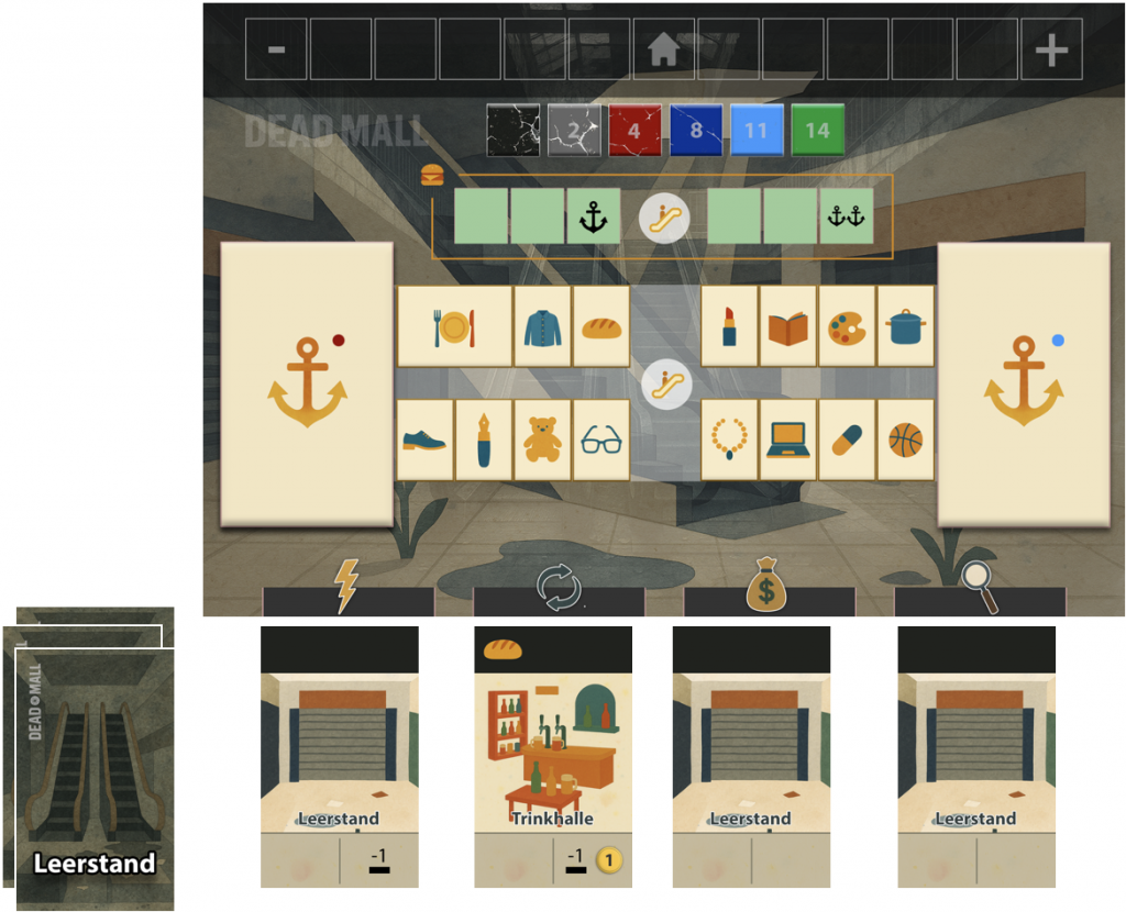 Die Karten teilen sich nicht nur in farbliche Kategorien auf, die sich auf die Entwicklungsstufen der Mall beziehen, sondern auch in Branchen.  Diese werden durch ein entsprechendes Symbol wiedergegeben.