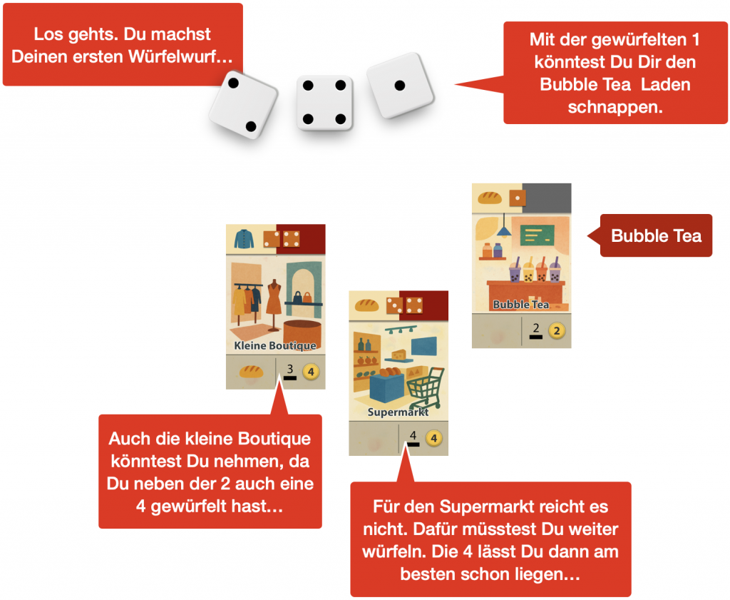 Jede Store- / Ankermieter- oder Food-Court-Karte hat Kosten in Form von einem bis drei Würfelsymbolen, die oben angezeigt werden. Genau diese Zahlen musst du würfeln, um die Karte in dein persönliches Deck aufnehmen zu können, und den betreffenden Store, Ankermieter oder die gewünschte Food-Court-Theke in deine Mall einziehen zu lassen. Die Kategorie eines Stores bzw. die Farbe einer Store-Karte darf dabei unberücksichtigt bleiben. Grundsätzlich kann jeder Store zunächst in jede Mall einziehen.