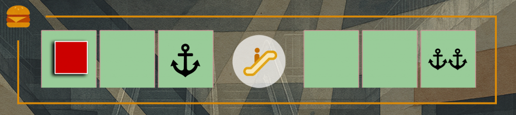 Wieviele Food Court – Theken es in der Mall gibt, wird durch den Marker auf der Food Court – Leiste angezeigt, der mit jeder Theke um ein Feld nach rechts verschoben wird. Das Feld mit der Fahrtreppe wird dabei übersprungen und bleibt somit unberücksichtigt.