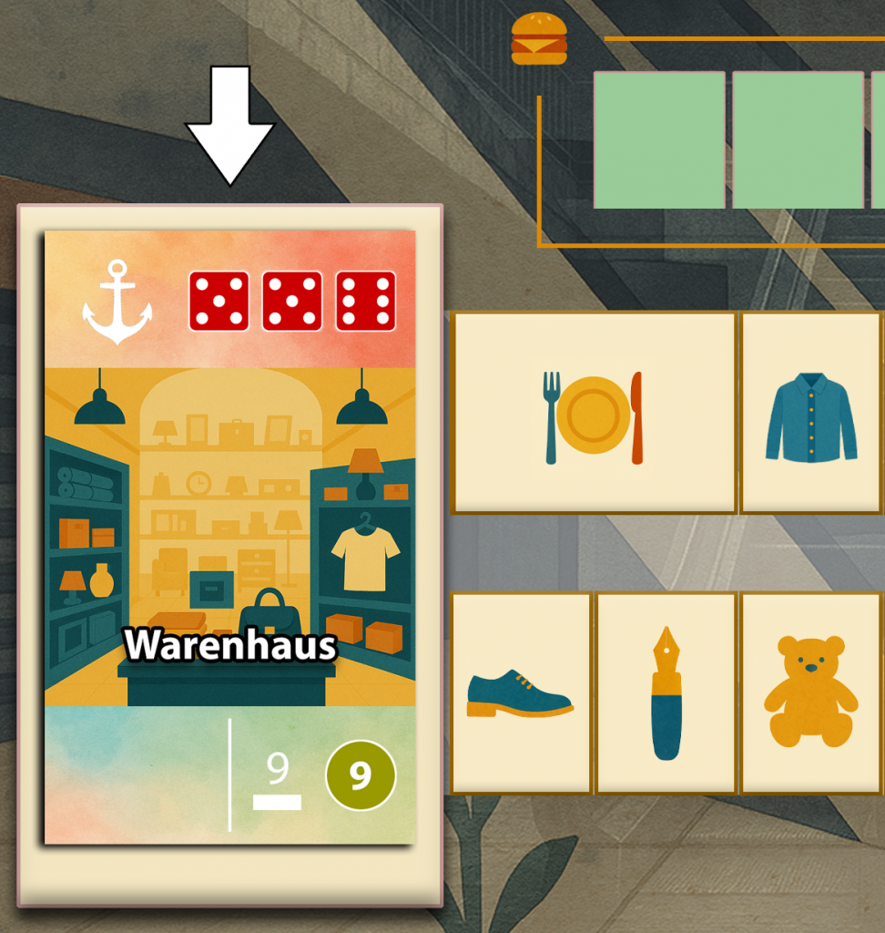 Im unteren Bereich der Auslage stehen dir noch je eine Ankermieter-, Food Court- und Ausstattungskarten zur Verfügung. Während du die Ankermieter- oder Food Court-Karten wie gewohnt bei Übereinstimmung der Würfelwerte nehmen kannst müssen die Ausstattungskarten mit Geld bezahlt werden.