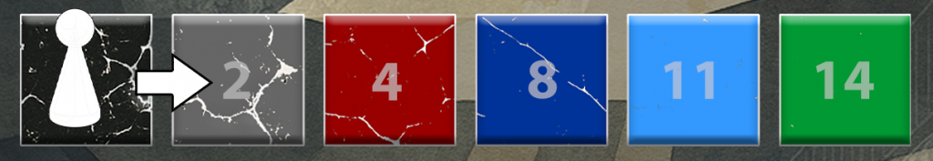 Auf der Liquiditätsleiste ist das Startfeld das Feld mit dem Haus-Symbol, und auf der Entwicklungsleiste muss der Marker auf dem schwarzen Feld ganz links platziert werden.