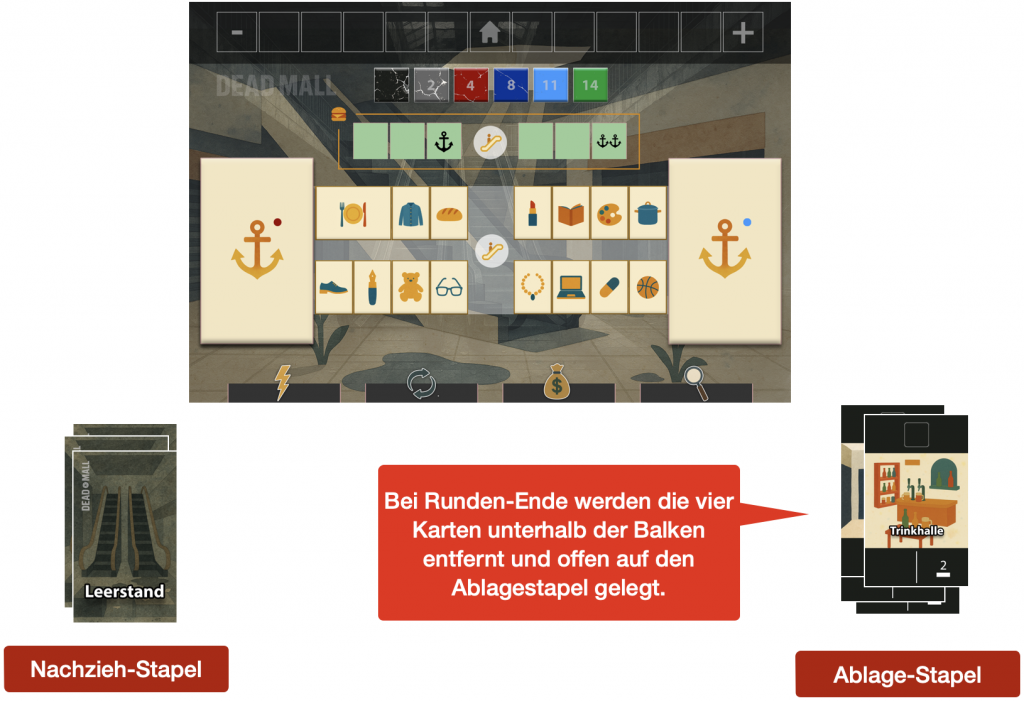 Die vier Balken unterhalb des Mall-Plans haben Funktionen oder lösen Effekte aus. Diese sind direkt beim Auslegen neuer Karten bei Rundenbegínn zu berücksichtigen.