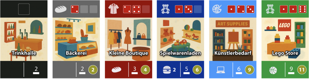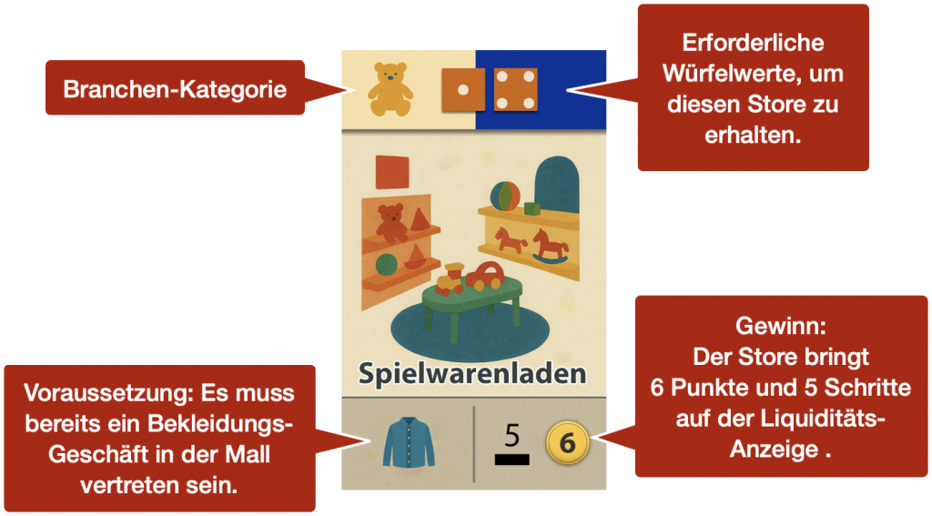 Unten rechts ist der Gewinn abgebildet, die Menge an Geld, die der betreffende Store bringt und die Verbesserung der Liquidität, durch die Anzahl der Felder, um die der eigene Marker auf der Liquiditätsanzeige nach rechts verschoben werden darf.