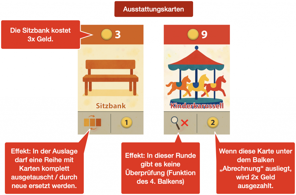 Liegt eine Ausstattungskarte später unter dem ersten Balken „Effekt“  aus, wird ihr Effekt aktiviert. Die meisten Ausstattungskarten bringen zudem etwas Geld, wenn sie unter dem Dritten Balken „Abrechnung“ platziert sind.