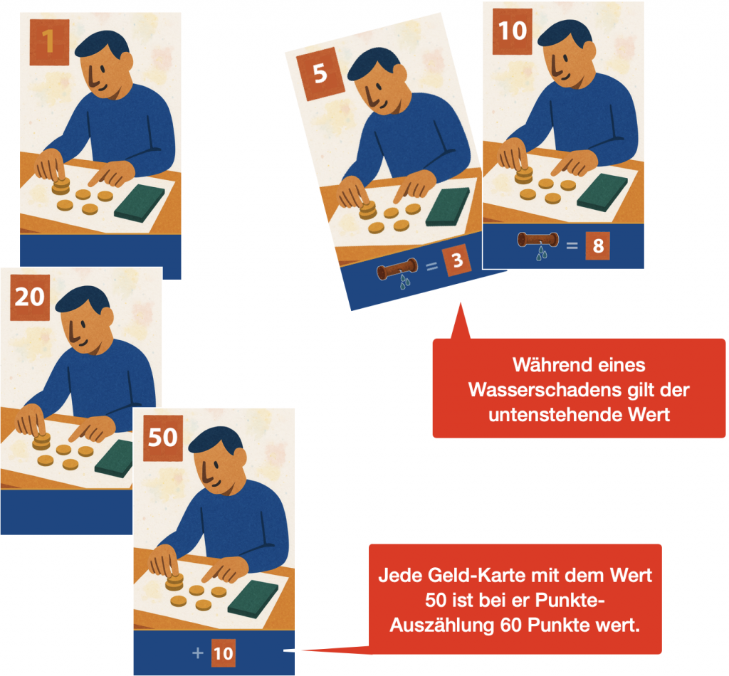 Geld wird im Spiel in Form von Karten ausgegeben. Diese Geld-Karten können dabei auch getauscht oder gewechselt werden, ähnlich dem Geldwechsel.