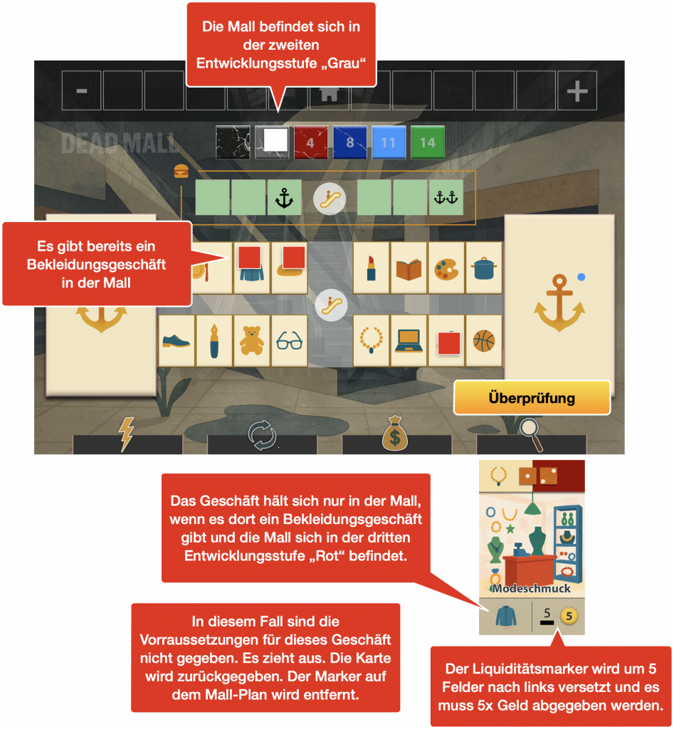 Die Karte die unter dem Lupen-Symbol liegt wird überprüft. Sind die Vorraussetzungen erfüllt? Wenn nicht, muss der Store ausziehen. Das kostet den Spieler die auf der Karte  angegebene Menge von Geld und Liquidität. Die Store-Karte wird abgegeben, der Marker vom Mall-Plan entfernt.