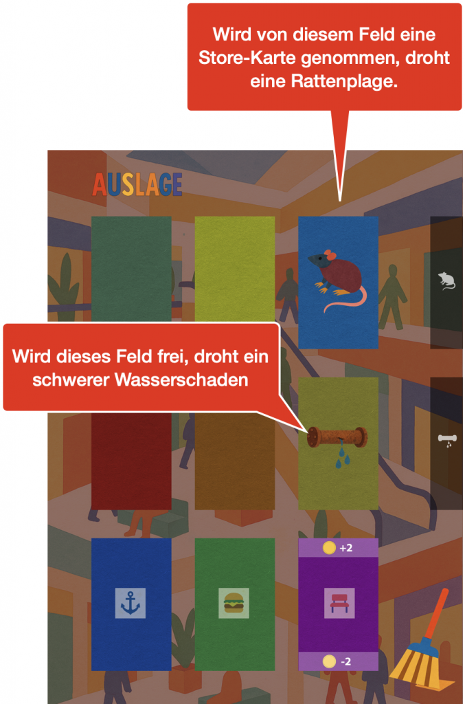 Eine Rattenplage oder ein Wasserrohrbruch werden immer dann ausgelöst, wenn eine Karte von der Auslage genommen wird, und sich auf dem Feld darunter das entsprechende Symbol verbirgt. Dies trifft jeweils auf das letzte Feld der ersten und zweiten Reihe zu.