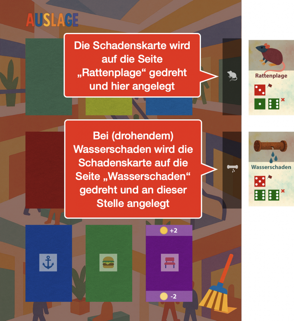 Füllt das leere Feld wie gewohnt mit einer neuen Store-Karte auf, nehmt aber zusätzlich die Schadenskarte und dreht sie auf die passende Seite (Rattenplage / Wasserschaden). Legt sie dann an den passenden Slot am rechten Rand der Auslage.