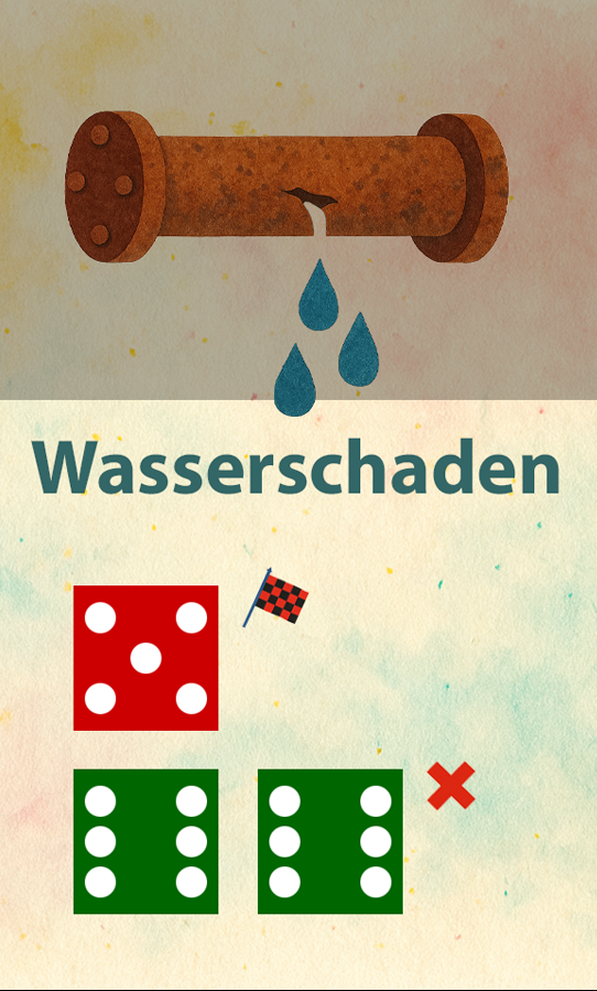 Der jeweils rote Würfel zeigt, wann die Rattenplage oder der Wasserschaden losbricht. Sobald ein Spieler den jeweiligen Wert würfelt, geht es los.