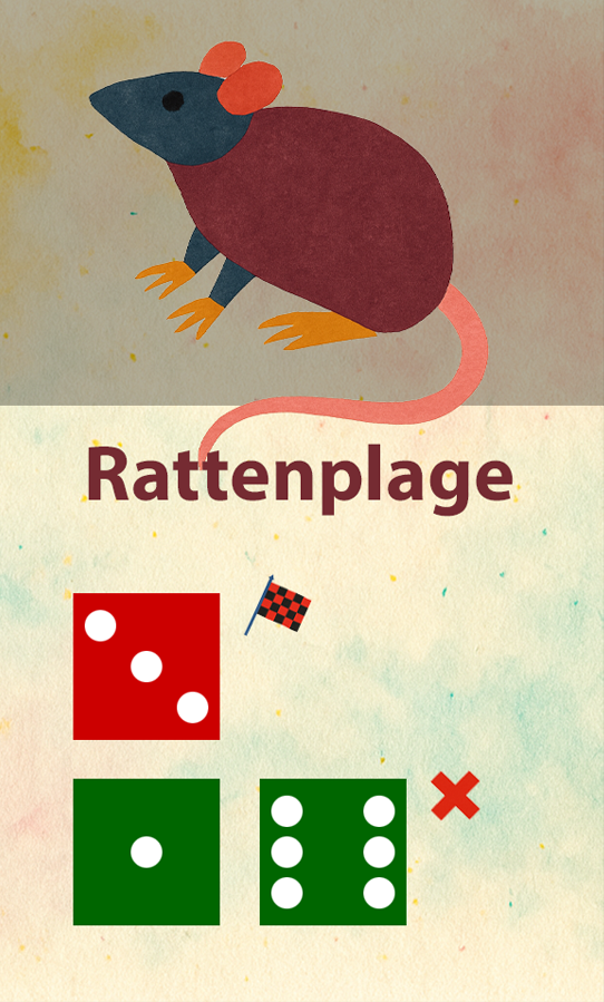 Die Karte zeigt einen roten und zwei grüne Würfel an (auf beiden Seiten). In dem Moment, in dem ein Spieler im Rahmen seines Spielzugs den Wert würfelt, der dem roten Würfel entspricht, wird die Rattenplage oder der Wasserschaden ausgelöst. Die Plage endet bzw. der Wasserschaden ist behoben, wenn ein Spieler vor sich zwei Würfel liegen hat, die mit den auf der Karte angezeigten Werten der beiden grünen Würfel übereinstimmen.