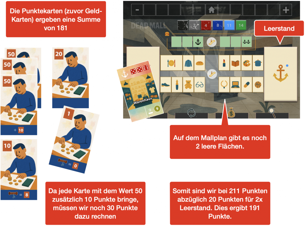 Die Anzahl der Siegpunkte errechnet sich durch die erworbene Geldsumme abzüglich der 10 Punkte für jeden einzelnen Leerstand.