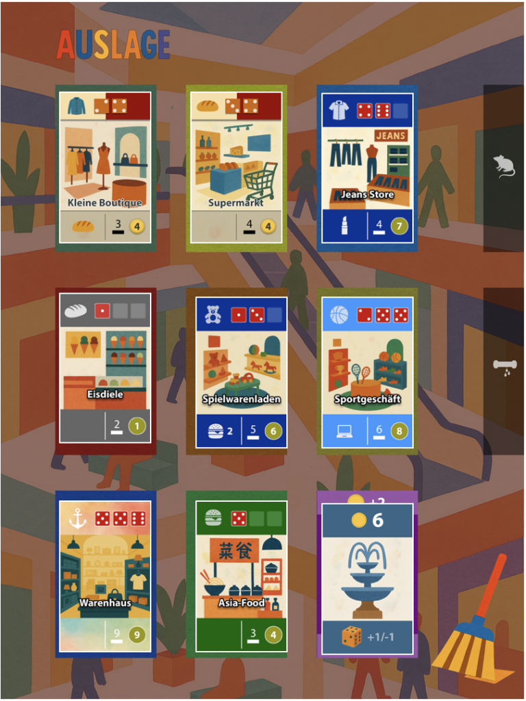 Diese Auslage bildet das aktuelle Angebot an Mietern und Ausstattung, aus dem ihr in jeder Runde Karten für eure Malls wählen könnt.